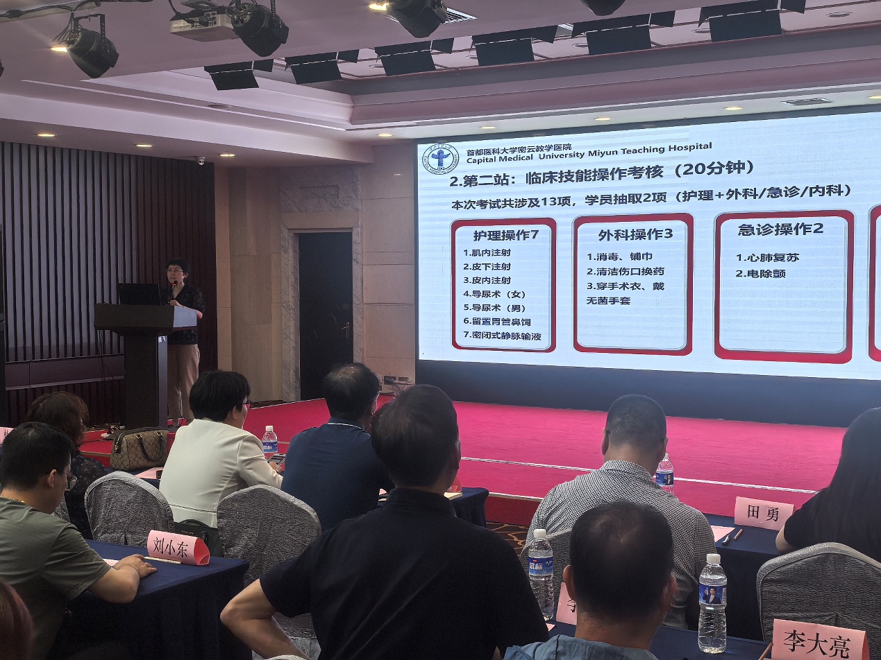 研讨会还邀请了密云教学医院科教科科长吴娜威介绍由密云教学医院承接的结业考核技能部分目前考生存在的问题。吴科长从考核内容,存在问题和总结改进三方面进行了分享,为有效针对考生薄弱环节进行辅导,提高技能考核的通过率提供了具体的思路和方法。
